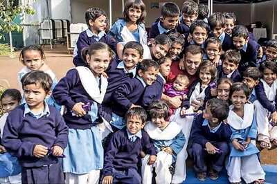 In the image, the actor is seen with over a dozen school children, who seemed more than happy posing with the 'Wanted' star.