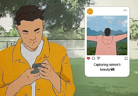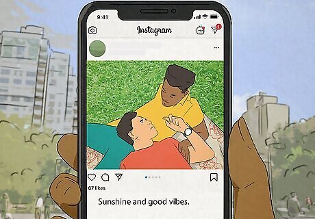 Write a short, memorable, and personal caption. According to social media expert Kasey Dunn, your caption should be concise to “captivate the audience in the first eight seconds” of seeing your post. Instagram hides the rest of your caption after a few lines of text, so include the most eye-catching details at the beginning. Other tips to create an engaging Instagram caption: Use quotes and song lyrics: If you’re struggling to write a caption, think of quotes and lyrics from your favorite authors, poets, and artists. Their words can perfectly describe your mood and the vibe of your photo. Include a question to increase engagement: This encourages your followers to leave comments and like your post. For example, you could caption a group photo with “Do we look normal?” or “Are you really friends if you don’t roast each other?” Add personality with emojis, slang, and references: Social media and digital marketing consultant Candace Gasper recommends “seeing what’s trending in pop culture and utilizing it in your post.” If there’s a viral song or meme, for example, you could reference it in your caption. Using emojis and slang terms like “swag,” “flex,” or “ride or die” can make your caption extra punchy, too.