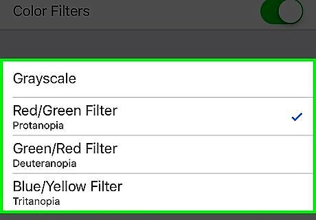 Tap a color filter to enable it. You can watch the colored pencil image to see what each filter looks like. Grayscale (no colors) Red/Green filter: For people with Protanopia (red/green colorblindness) Green/Red filter: For people with Deuteranopia (green/red colorblindness) Blue/Yellow filter: For people with Tritanopia (blue/yellow colorblindness)