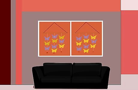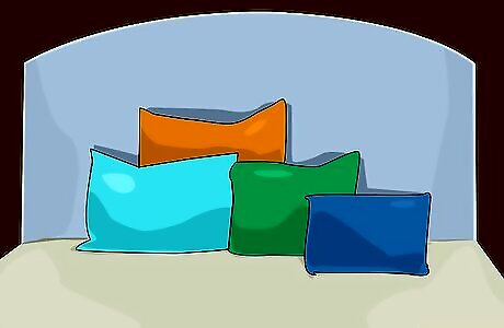 Drape pillows and blankets. Pillows and blankets can be cheaper than other types of decor, and they can be found in many different colors, patterns, and designs. They are perfect for living rooms, bedrooms, and other sitting areas. If you decide to change the color later, you can easily switch them out. Try layering pillows with different patterns or shades of color. These will add a dynamic effect to your sofa or bed. For example, your bed might feature a beaded purple throw pillow, a lavender neck bolster, and two sham pillows with a floral violet pattern. A blanket can be draped over a chair, the back of a couch, or tucked away in a basket. You can match the blanket and the pillow as well. For example, you might have two dark red throw pillows on your coach with a crimson blanket folded on the back of the cushions.