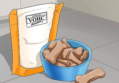 Get treats for your dog. Purchase treats while you're looking for food, as you'll need them for training your new dog. Look for brands approved by the Veterinary Oral Health Council. These will be marked with a “VOHC accepted” seal of approval. Remember treats should comprise a maximum of 10% of your dog's caloric intake.