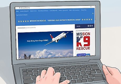 Adopt a retired military or police dog. If you're not committed to adopting a puppy and live in the US, you can rescue a retired military working dog (MWD) by applying here: http://missionk9rescue.org/. You'll need to show that you can offer enough space and can handle a MWD in your adoption application. In addition, while there are no adoption fees, you'll need to travel to San Antonio, TX, and transport your new dog to your home. Note that the adoption process can take some time, since MWD adoptions are both limited and popular. Adopting a retired police or military dog is usually reserved for individuals who have experience in properly handling the dogs. Additionally, they are not a good option for families with small children.