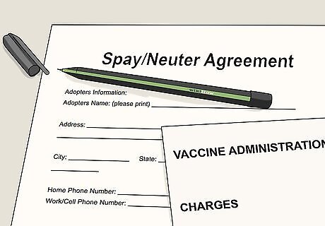 Set up your adoption. Once you find a dog you'd like to adopt, the shelter or rescue group should finalize the adoption with some form of contract. It should discuss any adoption or vaccination fees you're responsible for paying, and describe a spay or neuter agreement if you've made arrangements for a procedure with that organization. The shelter or rescue group should also provide instructions on how to care for your dog. It should include information about any specific health requirements your new companion has. Make sure you know if the dog has already been vaccinated, spayed, or neutered. Find out if you'll be responsible for providing vaccinations, initial veterinary exams, and spaying or neutering, and make sure you understand the costs. Some shelters will provide assistance with initial medical costs or waive adoption fees during certain times of the year.