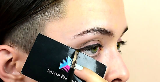 Don't use tape as a stencil. Some beauty websites recommend using tape as a makeshift stencil for a classic cat-eye look, but this may not be the best idea for people with sensitive eyes. Instead, you can hold a business card up to the corner of your eye to make a sharp, straight line. This also helps you avoid apply a too-thick line or spreading eyeliner outside the area you intended to apply it.