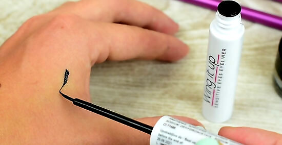 Test on your hand first. If you have sensitive skin, it’s important to test a potential eyeliner on your hand before applying it to your eyes. The skin around your eyes is thinner and more sensitive than other areas, so this test is not foolproof, but if you have an allergic reaction, you will know not to apply the product to your eyes. Check for contact dermatitis in the form of a red rash. This can happen right away. Watch for the symptoms of an allergic reaction. You also may develop a reaction in a different area of your body. If you have had reactions in the past, talk to a dermatologist before starting to use a new brand. It may take up to 24 hours for a reaction to develop, so wait at least a day before applying a new eyeliner to your eyes.
