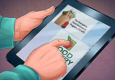 Get emergency food assistance. The Emergency Food Assistance Program (TEFAP) provides supplement food assistance in the form of groceries and meals. The food is principally distributed to local food banks, some of whom then pass the food along to soup kitchens and hunger relief centers. For a partial listing of food pantries by state, visit this website and click on your state. You can then call the food pantry or stop in if you have questions.