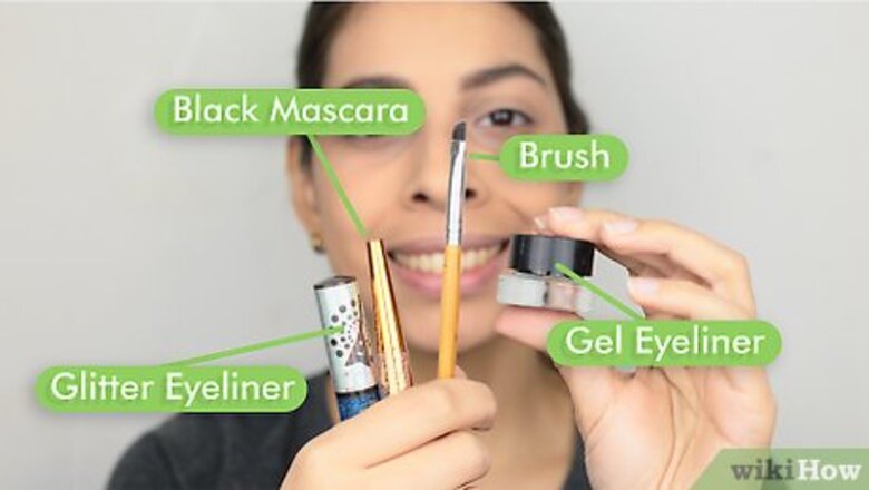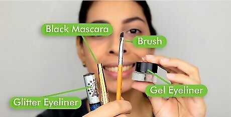 Collect your makeup and application tools. Creating the perfect glitter liner look is not difficult, but it requires some special makeup items and tools. To create a glittery eye liner look, you will need: eyeshadows in white, nude, light brown, brown, black, and champagne black gel eyeliner black eyeliner eye glitter with glitter adhesive a liner brush a blending brush a small flat brush a small fluffy eyeshadow brush a crease brush black mascara false eyelashes and eyelash adhesive (optional)