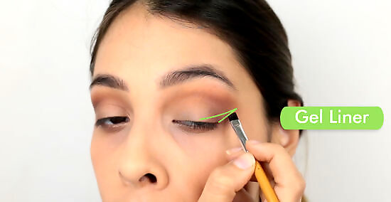Create wings with gel liner. To begin lining your eyes, you will need to apply some gel liner to a liner brush. Then, use the brush to draw wings on the outer edges of your eyes. You may want to start with a small wing and go from there. Start your first line near the outer edge of your upper eyelid and then extend it out and up. The line should have a noticeable swoop shape when you are done. Then, start your second line just below the first line, near the outer edge of the lower lash. Draw the line in the direction of the other line so that they meet at the ends.