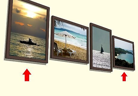 Line your photos up in a row if you want a traditional look. To line images in a row, use a level and a pencil to mark where you want to hang each photo. Measure the distance between each mark so that there is an equal amount of space separating each picture. Then, drill holes for your nails or hanging brackets. Try to keep an odd number of images on a wall—the eye is drawn to odd numbers. A linear arrangement is a good middle-ground between showcasing your photos and not overwhelming your viewer with too many images. If your frames have different hook locations, you’ll have to measure the difference between them with a measuring tape to match the tops of your frames on the wall. It is better not to put too much stuff on one wall. It gives people a chance to appreciate the pictures, and the wall does not look cluttered.