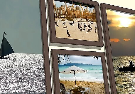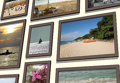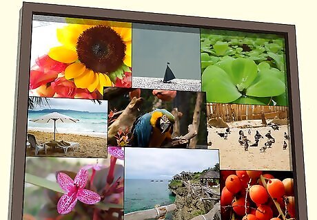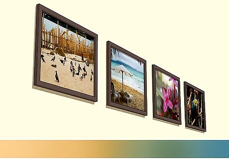 Stack photos directly next to one another to create a collage of images. If you have unframed images, you can stack them directly on top and next to one another with no space in between to create a collage. This choice works particularly well with 4 in × 6 in (10 cm × 15 cm) and 5 in × 7 in (13 cm × 18 cm) prints, as the final result will be reminiscent of a photo album or yearbook. This option is an excellent choice if you have a lot of photos and want to showcase all of them without spending a lot of money on frames.