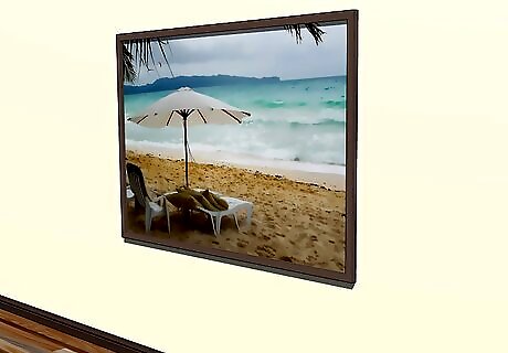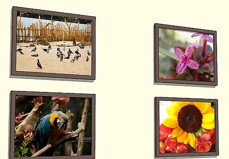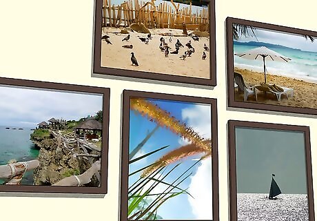 Place smaller images in a grid pattern to fill in bigger walls. If you have a large wall that dominates a room but don’t own any large pictures, place 4-10 smaller images in identical frames in two symmetrical rows directly above one another. This will create the same visual impression as a single large piece, and will allow you to showcase a variety of different photos. Use a level and painter’s tape to create your 2 rows and make sure that they’re symmetrical. Line your level up so that it’s flat on the wall and use a large piece of tape to create your guiding line. Use identical frames to make your arrangement aesthetically uniform.