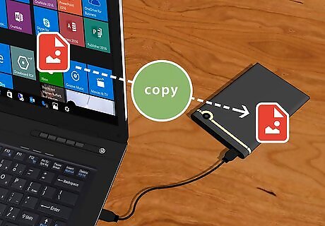 Backup your images by putting copies on a thumb drive. Copy all of your photos and paste them into a thumb drive or external hard drive. This will ensure that your photos aren’t permanently lost if your hard drive crashes or your computer gets damaged. If your collection is large, or you shoot in the RAW format, the transfer could take a while. Don’t unplug your backup drive while the copies are transferring; you could damage the drive or lose some photos if you do.