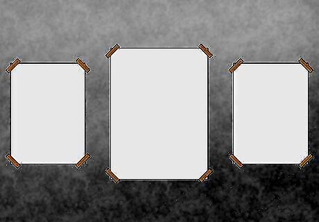 Tape pieces of paper to the wall to see how you feel about an arrangement. Measure the size of each frame that you plan on hanging. Cut out pieces of paper with a pair of scissors to match the size of each frame. Use painter’s tape to put them on the wall in different combinations and orders to come up with an arrangement that you like. Painter’s tape won’t leave any residue behind after you peel it off of the wall. If you use any other kind of tape, you may damage your wall or make it sticky after you peel your tape off.
