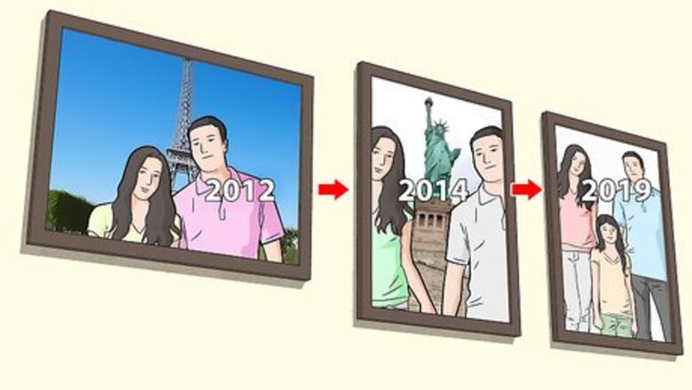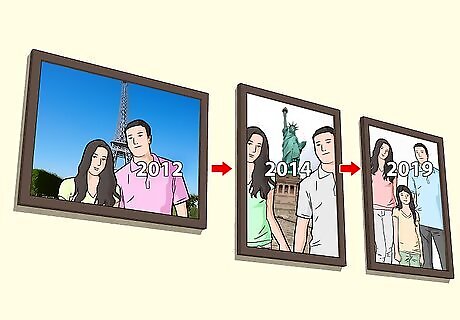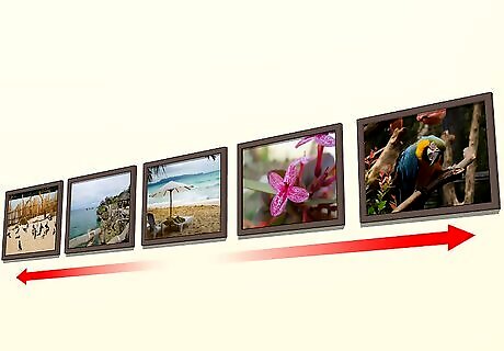 Order pictures chronologically to create a timeline of an event. If you want to create the impression of a narrative between your photos, place photos from oldest to newest going from your left to right. This order works well for wedding photos or family photo albums, since the viewer will be able to see a progression of events as they go from image to image. For example, if you have a sequence of photos from a graduation, put the photos of the student getting ready and putting their robes on at the beginning. End the sequence with the photos of the graduation party or dinner. This creates a narrative sequence that makes the context of each individual photo easy to understand for the viewer.