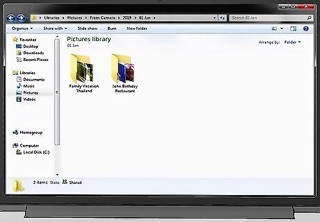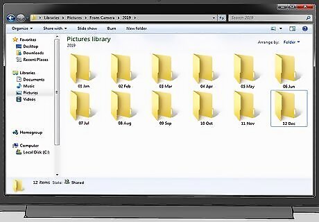 Arrange folders by date if you take a lot of photos. In your photos folder, create a folder for each year represented in your collection. Inside each of your year folders, create a separate folder for each month in the year. This will make it easier to find photos, especially if you take a lot of them. You can use the event as a reference point to easily find photos if you organize them this way. For example, if you’re looking for graduation photos, you’ll know they’ll be in the May or June folder. If it was snowing when a photo was taken, you know to look through November-March to find the photo.