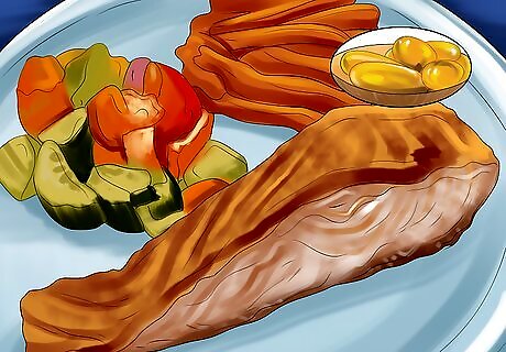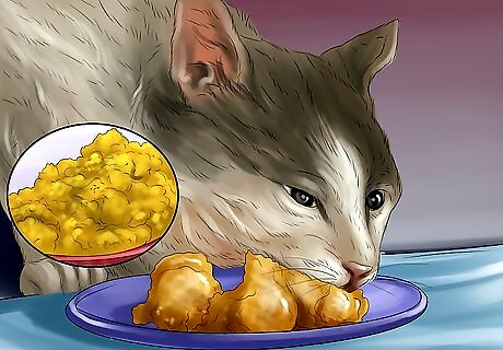 Feed your cat cooked salmon or chicken. If you want to give your cat people foods that they will enjoy and can eat safely, start with cooked foods like salmon or chicken. Remove the skin from the chicken before you serve it to your cat to reduce the fat content. Cats are carnivores and require meat in their diet. Cooked chicken is a good protein source for cats. Cooked salmon also provides omega-3 fatty acids for your cat. You can also give your cat other cooked meats like beef or pork. Cooked fish like cod or tilapia are also good for cats.