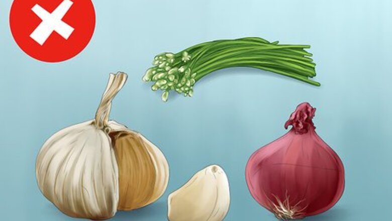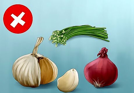 Do not give your cat onions, garlic, or chives. Onions, garlic, and chives contain properties that can cause anemia if consumed by your cat. This can also lead to jaundice and damage your cat’s red blood cells. Even a few slices of onions, garlic, or chives can be toxic for cats. This applies to uncooked and cooked onions, garlic, and chives.