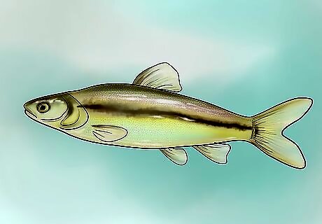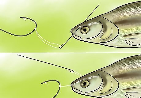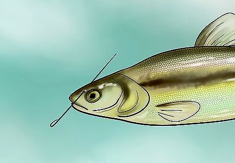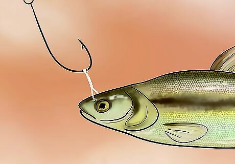 Use minnow or sardines as a general purpose bait fish or specialize with another variety. Many fish feed on minnow, but make sure you pick a size appropriate for your target fish to eat. Sardines also make great bait and attract most fish. Ask at the bait shop what kind of local fish your target eats, too. If you are dragging the bait behind you in a moving boat (trolling), hook the fish under its jaw and exit through the top, or just through its upper jaw for especially large bait fish. Alternatively, you can hook it through both nostrils. Any of these hook methods will maximize the fish's ability to swim with a natural motion to attract predator fish. For fishing while still or moving slowly, hook the bait fish on its back just in front of the dorsal fin. Hook it underneath the spine to avoid paralyzing it. This forces the fish to swim more frantically and head-downwards, attracting attention. You can fine tune the depth by placing it further ahead of the dorsal fin; this causes it to swim at a shallower downward angle. If you are freelining (fishing while stationary, using no floats or weights), you can hook the bait near the tail to make it swim forward. To force it to swim downward instead, hook into the mouth and exit through the gills.