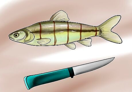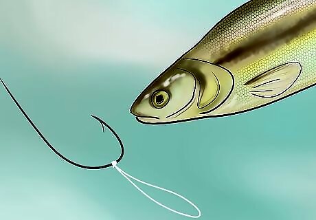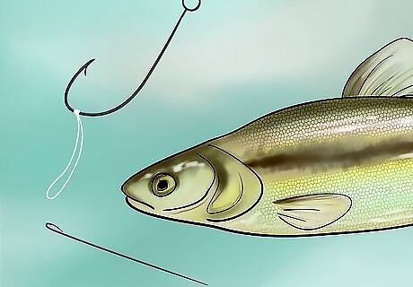 Use fish pieces to attract fish that hunt by scent. This includes many saltwater fish such as sea trout and bluefish, as well as freshwater bottom feeders such as carp and catfish. If you are fishing from one spot (still fishing), cut the fish into chunks thick enough to hide most of the hook. If you are dragging the fishing line behind a moving boat (trolling), cut the fish into long, thin V-shaped strips. Pierce the hook through the thicker end so the moving strip imitates a swimming fish.