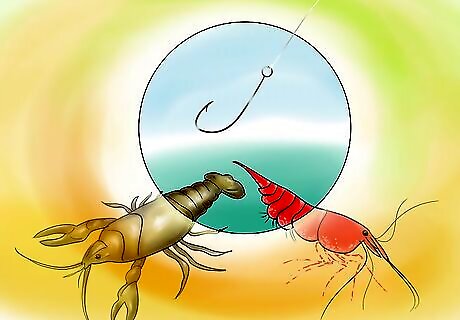 Hook certain species with crayfish. Fish that are attracted to crayfish bait include smallmouth bass, catfish, and walleye. Thread the hook shallowly through the back or front of the crayfish, pushing it out again on the same side. Don't go any deeper than necessary to get under the main shell segment, or you may kill the crayfish. Alternatively, thread the hook through the meaty tail. This can hide most of the hook and will not hit any of the crayfish's vital organs. Start at the end of the tail and push the hook out just before the body.