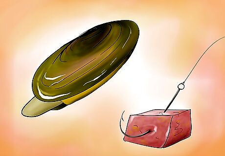 Use local clam and other soft meat. Shellfish are great for attracting fish in their native area. Clams, mussels, liver, and other soft meat should be left out in the sun to harden before use, or else frozen beforehand and used when partially thawed. Once the meat is hardened, pierce the hook through it in as many different places as possible. Hide the end of the hook in the meat. If it still won't adhere to the hook or you suspect a fish could peel it right off, use fine thread or wire to tie it on.
