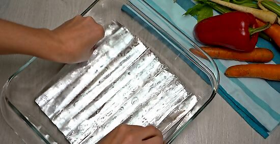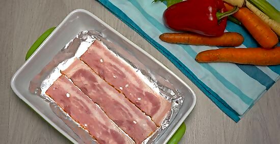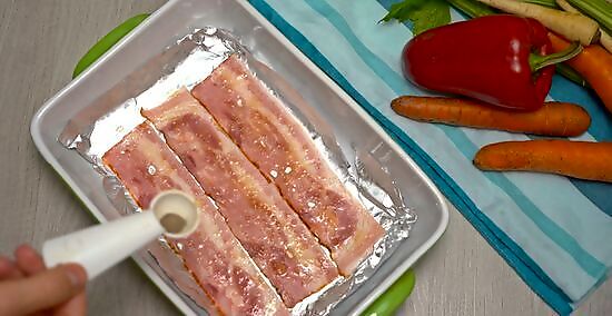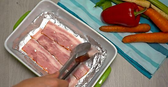 Drape the turkey bacon across the foil ridges. Place the ridged foil on a baking sheet and lay as many pieces of turkey bacon as you like across the ridges. Avoid letting the slices overlap or the sides won't crisp up.