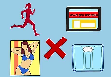 Stay away from triggers. Social, emotional, and psychological events that trigger feelings of poor self-image, low self-worth, or similar problems must be avoided, especially while you are actively on the road to recovery. It is important to examine the factors outside of yourself that could be having an effect on your behaviors. It's not blaming someone else or shirking responsibility; it's being able to gain a panoramic view of your life rather than an "up close" selfie. You may need to give up or rethink your participation in certain sports or activities with a focus on a thin body, such as ballet, gymnastics, modeling, acting, running, figure skating, swimming, jockeying, and wrestling. Avoid looking at fashion and fitness magazines. Do not visit any websites that are pro-anorexia. Distance yourself from friends who are always dieting or discussing weight loss, or who encourage unhealthy weight loss (holding binging and eliminating parties, making weight-loss pacts, etc.). Resist the urge to step on the scale.