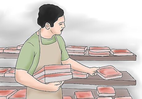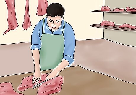 Be prepared to start low and work your way up. The work world usually has a pecking order, and the meat cutting industry is no different. Expect to start off as low as low goes and work your way up. Starting low will help you get your foot in the door. Here are some possible options for where you could start off: Meat clerk. Meat clerks usually wrap and work lunch meat, as well as clean the meat shop at night. Seafood helper. Similar to a meat clerk, except you'd be working with seafood instead.