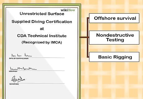Pursue specialized certifications at CDA Technical Institute if you want a specific job. Options include: Offshore Survival, Nondestructive Testing, and Basic Rigging. Look at the job description of the position you want to see which certifications are required before getting them. If you are qualified for a position without additional advanced certifications, you may choose whether or not to pursue them. The Unrestricted Surface Supplied Diving Certification offered at CDA Technical Institute is recognized worldwide by the IMCA (International Marine Contractors Association), and will be necessary if you plan on working offshore in other countries.