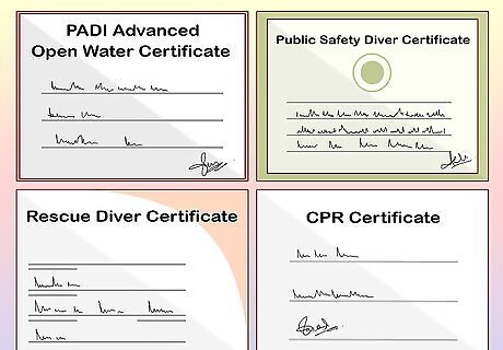 Pursue your PADI Rescue Diver certification if you want to become a rescue diver. You will work with the police and military on search-and-rescue missions, controlled demolition, and more. You will need to gain your PADI Advanced Open Water certification, Public Safety Diver certification, and the Rescue Diver Certification. You will also need First Aid/CPR certification before you can apply for jobs as a public safety diver.