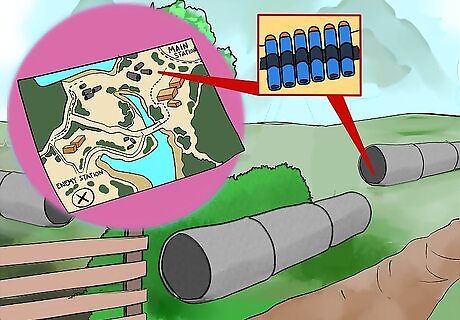 Construct a base. This is an important place because you will store your Weaponry and Ammunition here. Make sure it is well defended, because if the enemy team gets to it, they will have a bounty of items to use. One idea is, to have a reliable easy security system. During a Nerf War, have at least one person who guards the fort. Another good plan is to have other little bases in the area, so if you main base is captured by the enemy, you can retreat to a smaller base to regroup your team and nerf guns