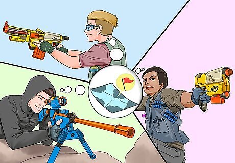Ensure that the team is reliable and that each member knows their roles and what they are good at. You can train them yourself to fit your style of fighting, but at least consider their thoughts when they come to you. They may not be happy with their role or guns, so you have to listen to them. Your standard team should consist of as many people you can. This listing is assuming you have around ten people. Have two-three Infantry. They are the backbone of your team. Their primary weapon should be either the Spectrum or Hera. They should preferably have the Kronos as their sidearm. Have two Snipers. They should be armed with a Nexus Pro and a bi-pod and perhaps a scope, and should be sniping from some sort of cover. Have two Scouts. They should be armed with two handguns, preferably Blitzfires for their power and easy prime. Scouts will go ahead on the battlefield to see what the enemy is doing. You only need one Melee Warrior. They should be armed with the Nerf Warlock (a Battleaxe), the Nerf Marauder (a long sword), or Shadow Fury and Thunder Fury (twin swords). They might have a Storm Squad as their sidearm. A tank is good as a battle opener or backup. You only need one Tank, but they should be equipped with heavy armor and at least three weapons. They will need a backpack or holster to carry it in. Good weapons are the V-Twin, Tomahawk, Savage Spin, Nemesis, Prometheus, Matrixfire, Commandfire, or Destructor. The Assassin is the ultimate weapon in terms of hit-and-runs. They are good at stealth, and can spy, or infiltrate the enemy's base to silently take down an enemy warrior.