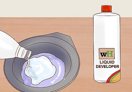 Mix the powder bleach with the liquid developer. Carefully open the powder packet and pour the contents into a plastic bowl. Then, pour in your developer. The rule for how much developer to use is a ratio of 1:2–1 part bleach powder to 2 parts developer. So if your bleach powder packet is 1 ounce (28 g), then add in 2 ounces (57 g) of developer. If your powder comes with a scoop, simply use the scoop to measure out twice the amount of developer. If your powder doesn’t have a scoop, pour it into a measuring cup before putting it into the bowl so you know how much developer to add. Or, if you have a small scale, then you can use that to measure out the amount you need.