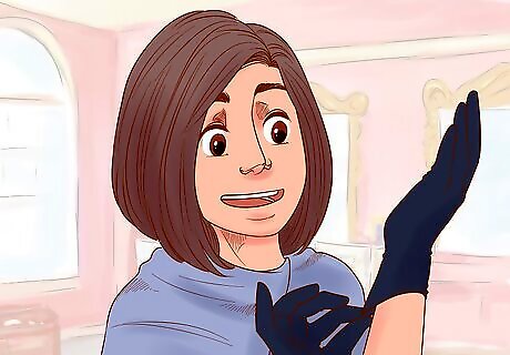 Put on gloves and an old T-shirt before mixing the bleach. Always wear latex or rubber gloves when you work with bleach. Take a few minutes to change into an old shirt and pants that you won’t mind getting bleach on in case you spill or splatter any of the bleaching liquid as you work. If you have long hair, you may want to tie it back, too, so it doesn’t accidentally fall into the bleach or onto your weave as your working with it.