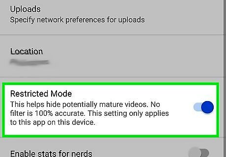 Tap the switch next to "Restricted Mode" to turn it on Android 7 Switch On. This will block search results that contain adult terms, hides inappropriate words in comments, and blocks videos that are not deemed appropriate, but it's not 100% accurate.