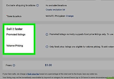 Promote items through eBay to bring more traffic to your listings. eBay allows you to boost your store listings for a small percentage of the sale price. When you make your listing, select the box under Promoted Listings and select the percentage that you’re willing to give to eBay. Once you set the percentage, your listing will feature more prominently in searches and your products will get more views. The higher percentage that you allow eBay to take from the sale, the more traffic your item will receive. The average percentage that eBay takes varies between categories, but it’s usually between 3–10%. The percentage eBay takes from a promoted sale does not include any fees that eBay already takes.