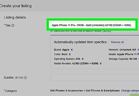 Include product keywords in the title of your listing. Be sure to include the name of the brand and product right in the title so it shows up in searches right away. Specify any details that make your product unique, such as the year it was made, the condition it’s in, and the available size. If you don’t know what keywords to include, try searching for the product on eBay to see how other sellers are listing the information. For example, rather than writing, “Madden 2019 Game” as a title, you may instead specify, “Madden 2019 Game for Xbox One, New in Shrink Wrap in Box.” If you’re selling a pair of jeans, your listing may look like, “American Eagle Women’s Skinny Jeans, Size 2 Regular, Light Blue.” Check the spelling of your listing title since they may not show up in searches if there’s a misspelling.