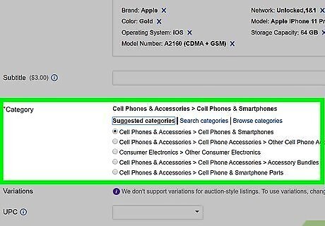 Adjust the product’s category so it’s grouped with similar items. eBay will automatically try to detect what category of products your listing fits, but it can sometimes make mistakes. Look for the Category option of your listing and select the one that’s most applicable to your item. There may be additional subcategories to choose from once you select the first one, so be sure to specify what it fits into the best. For example, if you’re selling a sundress, the category it would best fit into is Clothing, Shoes, and Accessories. There may be multiple categories that your product fits into. Try searching for the product on eBay to see what category other people are listing it under. For example, put stuffed animals in the Dolls & Bears category instead of Toys & Hobbies.