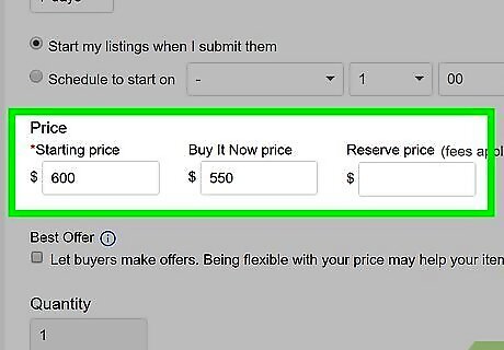 Price your items at the lowest price that similar products have sold for. Look up the product you’re listing through the eBay search and sort the list by items that have sold. Pay attention to the prices that the items have sold for in the past and how long it took them to sell. Set your prices about the same as the lowest one from your competitors so buyers are more likely to see your product, but you’re still able to make a profit. For example, if a pair of shoes recently sold for $120 USD, you could set the price for the same pair at $120 as well. Keep in mind how much your expenses cost and charge enough for your item to make a profit. You can also use the “Price it for Me” tool on eBay, which automatically compares similar products, but it may not be as reliable as setting the price yourself. Look up prices on other websites as well to see how much they’re charging. For example, look at similar items on Etsy if you sell craft products.Warning: Don’t base your list prices off of other sellers’ asking prices since they may not have done research and they may be over- or underselling.