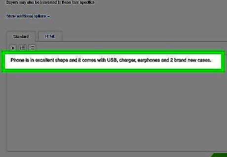 Add high-quality images of the product you’re selling. Put the product in front of an empty background and make sure the area is lit well so you can see everything. Use your phone or digital camera to take pictures from multiple angles so buyers can see the product. Make sure to photograph any details or damage that you specified in the listing so the buyer isn’t surprised when they receive their product. You can upload up to 12 pictures per listing, so choose the best photos you’ve taken. Don’t use stock images that you found online since it could make your listing seem like a scam.