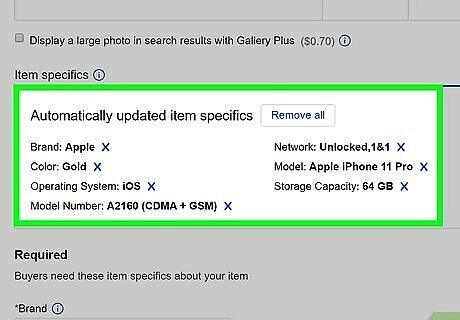 Provide detailed information in the product description. Use the description to provide any additional info you couldn’t include in your title, such as manufacturer and product numbers. Break your sentences into bullet points so it’s easier for your customers to scroll through the listing and find what they’re looking for. Avoid using a lot of special formatting, such as colored or bold text, since they can look distracting and hard to read. Mention positive customer feedback you’ve had in the past if you have any. You can either quote positive reviews directly or mention that you have many happy customers so buyers check your feedback rating. Some categories on eBay, such as electronics, sporting goods, and baby supplies, require product identifiers like the brand, product IDs, and manufacture dates if you’re listing them new or refurbished.