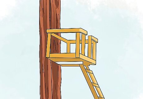 Place a tree stand in your chosen location. Once you’ve settled on an area that deer are frequenting, you’ll want to set up your tree stand within good range. Twenty yards or closer is recommended. Choose an appropriate tree for the stand, which is at least eight inches in diameter and fifteen feet high. If there’s not a good tree for a stand, you can set up a ground blind. You’ll want to do this at least a month before hunting season opens, so that the deer will get used to it being there. The best time to set up a tree stand or blind is between noon and 3pm. This window is when deer are least likely to be around. Trim some of the trees around the area to clear a few shooting lanes for yourself. Make sure you clear shooting lanes for any possible direction a deer might approach.