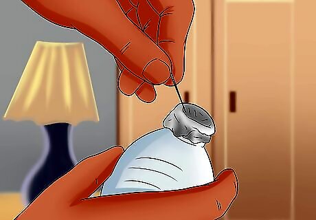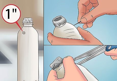 Make a hole in the bottle. You can use a pair of scissors or an x-acto knife. If you choose to use an x-acto knife, be careful. The blade will be very sharp. Make the hole on the opposite side of hand you'll use to hold the bottle. For example, if you hold the bottle with your right hand, make the hole on the left side. Use your needle or pin to get the hole started. If you use the scissors or x-acto knife right away, you may accidentally rip the bottle. Make a very small hole using a pin or needle. Use your scissors to gently twist the hole to make it a bit wider. The hole's diameter should be about once inch.