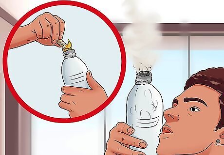 Use the bong. Now, you can use your bong. Pack the tobacco or the marijuana in the tinfoil bowl on top of the bottle. Place your mouth over the hole. Light the tobacco or marijuana and inhale. The smoke will be drawn though the bottle and then pass through the hole. You will inhale the smoke trapped in the bottle. If you have trouble inhaling the smoke, make the mouth hole slightly bigger.