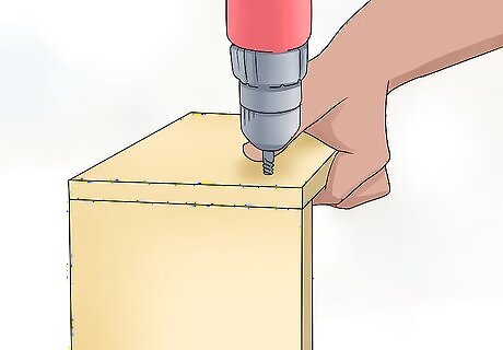 Drill pilot holes and attach the back panel. Place the rectangular frame flat on its front. Place the back piece of plywood you have cut out onto the frame, making sure it is exactly the same shape as the frame. Then drill pilot holes through the plywood and into the frame. Put pilot holes all around the edge of the plywood every few inches and then screw screws into those holes. When drilling pilot holes, be careful to get them into the frame and not into the empty space in the middle of the frame. To do this, make pilot holes a standard distance from the edge of the plywood. This distance should be half the width of the frame pieces, so that the screws are positioned in the middle of the frame pieces.