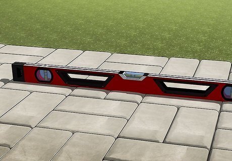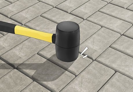 Tap the pavers into place with a rubber mallet. Pound the top of the stones to set them deeper into the sand. This can be a painstaking process, but it’s crucial for ensuring that the pavers are stable enough to stand, walk and set furniture on. Don’t attempt to secure the pavers by simply stomping on them. This may cause them to sink too deep, or knock them out of alignment. If you find that the pavers are sitting unevenly, you may need to work them deeper into the substrate by hand.