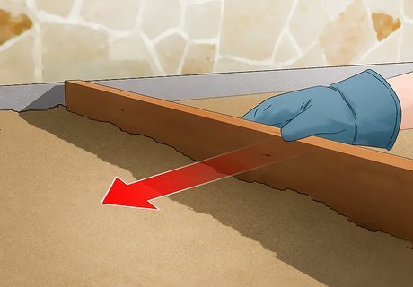 Level the sand with a flat board. To avoid over or under-filling the base, cut a couple lengths of 1-in (2.5-cm) PVC pipe and place them parallel to one another down the middle of the pit before you pour in the sand. Then, drag a flat board, like a 2x4, along both pipes to level the heap. When you’re done, pull out the pipes, fill in the depressions, and tamp the entire surface flat. Rather than dumping in all of the sand at once, proceed a few feet at a time—pouring, smoothing, and repeating.