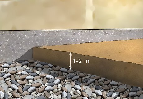 Add 3 in (7.5 cm) of leveling sand. This layer will fill in the cracks in the gravel. It will also give the paver stones something to settle into, offering additional stability. Snip a corner off of the bag and sift it slowly, guiding it from one side of the pit to the other.