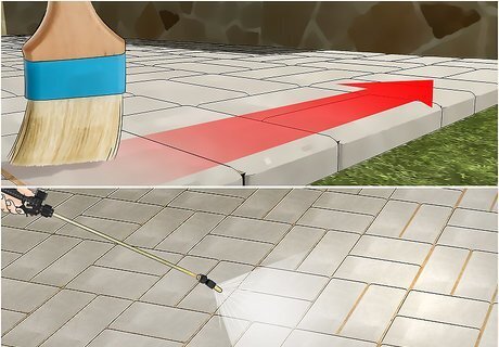 Seal the patio once it’s dried. To keep the sand in the joints and protect your new pavers, you should apply a sealer to the patio once it is completely dry. Use a 4-inch (10-cm) brush to apply sealer to the outsider perimeter of the patio. Then use a garden-style pump to spray sealant over the rest of the patio. Allow it to dry completely, then repeat the process to apply a second coat. Paver patio sealer can be found at home improvement stores.