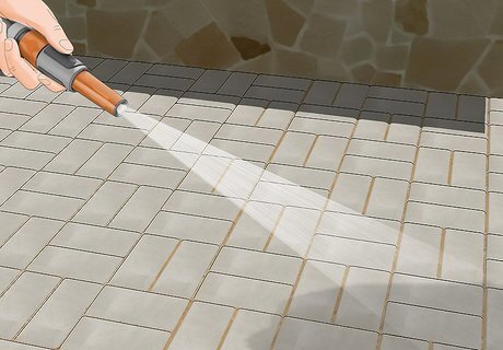 Hose down the entire patio. A good spray will help the pavers settle and pack the underlying substrate down tight. Just make sure you don't oversaturate the area, or you could end up with a swamp instead of a relaxing outdoor lounge. Once the water has had time to dry, you can replace your furniture and kick back! Wet the patio every hour for the first 3 hours to accelerate the compacting process.